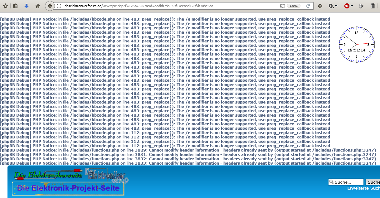 Manfred schrieb: > Wenn Du das meinst - ja! Ich sehe den gleichen Fehler bei fast allen Beiträgen, zum Beispiel bei diesem: http://daselektronikerforum.de/viewtopic.php?f=53&t=18485 Sieht für mich so aus, als ob der Betreiber sein PHPBB vor dem PHP upgrade hätte aktualisieren sollen.