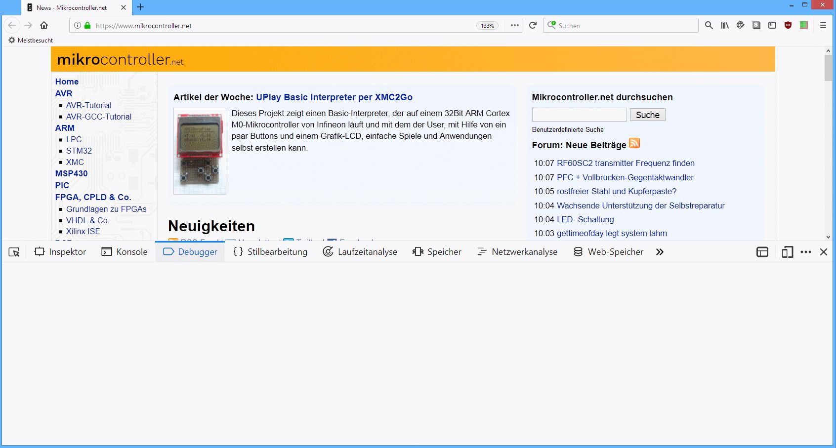 Der Betreff sagt es schon: den Debugger des Firefoxes kann ich nicht (mehr) aufrufen. Alle anderen Menüpunkte (siehe Bild) kann ich aufrufen. Nur beim Debugger bleibt der untere Bildschirm leer. Mozilla rät alles zurückzusetzen. Da dabei alle Einstellungen verloren gehen schrecke ich davor zurück. Gib es eine Möglichkeit dem Fehler auf die Spur zu kommen? JavaScript ist aktiviert. Werden uMatrix, uBlock deaktiviert ändert sich nichts. Was mir noch aufgefallen ist, der Bestellbutton von Alternate funktionierte gestern bei einer Bestellung nicht. FireFox und alle anderen Programme sind aktuell. Auf einem 2. Rechner mit gleicher Ausstattung/Konfiguration läuft alles einwandfrei.