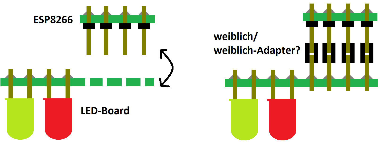 Hallo zusammen, ich komme eher aus der Software-Ecke und bräuchte von euch mal einen Hardware- bzw. Löttipp: Ich habe ein einseitiges (!) Board mit mehreren LEDs, die auf der von den LEDs abgewandten Seite des Boards verlötet sind. Auf dieses Board möchte ich einen ESP8266-Chip aufstecken (nicht fest verlöten) können. Allerdings kann ich dies aus Platzgründen nicht auf der "LED-Seite" tun. Ich hoffe, das ganze geht aus dem angefügten Bild gut hervor. Gibt es dafür weiblich-weiblich-Adapter, mit denen ich das bewerkstelligen kann? Oder gibt es irgendeinen Trick, sowas zu kombinieren? VG, Jens