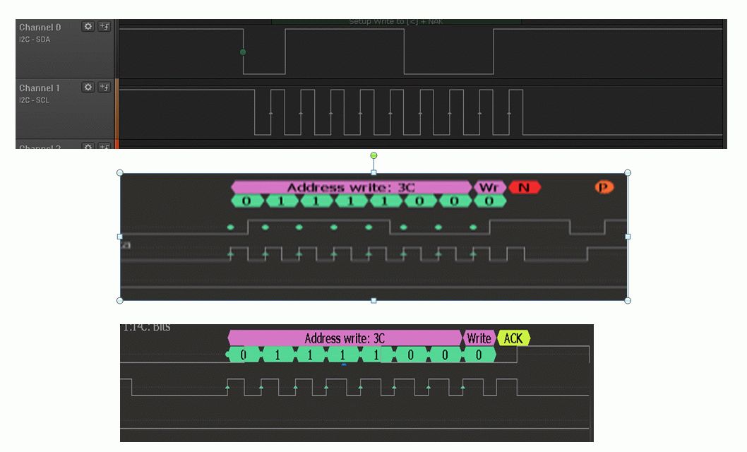 Hallo, manche I2C Slaves mögen es absolut nicht wenn es keine sauberen Start- und Stop-Condition gibt. Vor allem wichtig sind vorhergehende Stop-Conditions um dann wieder sauber neu zu beginnen. Ich kann sie auf deinen Bilder nicht wirklich (richtig) erkennen !!! Gruss