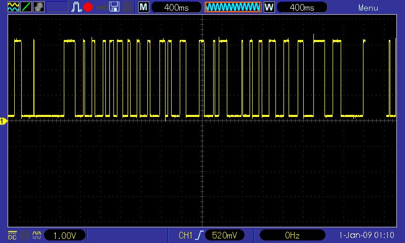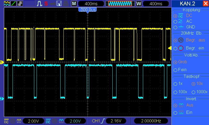 Ozvald K. schrieb: > Das passt schon nicht, 60 Zustände pro Minute höchstens, aber 1 Bit pro > Sekunde Nee, das passt schon! Es werden zwischen 5 und 10 Zeichen übertragen pro Sekunde. 100 ms Absenkung stehen für den Wert „0“, 200 ms für „1“. Es wird nur jede Minute EIN Telegramm gesendet. Und dazwischen ist halt Pause.