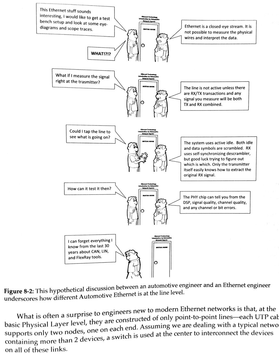 Ich lese gerade (siehe Bild): > Automotive Ethernet is a closed-eye stream. > It is not possible to measure the physical wires and interpret the data. Also benötigt man zum Lauschen an den Daten einen man in the middle, also ein "inserted Network TAP". Bei b-plus wird von einer "Layer 1 Technologie für geringe Latenzzeiten" gesprochen: https://www.b-plus.com/produkte/automotive/entwicklungswerkzeuge/netlion1000.html Hat einer von Euch eine Idee, wie man die Daten auf Layer 1 direkt durchleitet, damit keine nennenswerte Latenz entsteht? PS: Dabei müsste der TAP ja für RX und TX unterschiedliche MAC-Adressen vortäuschen, also an beiden Anschlüssen über Kreuz.