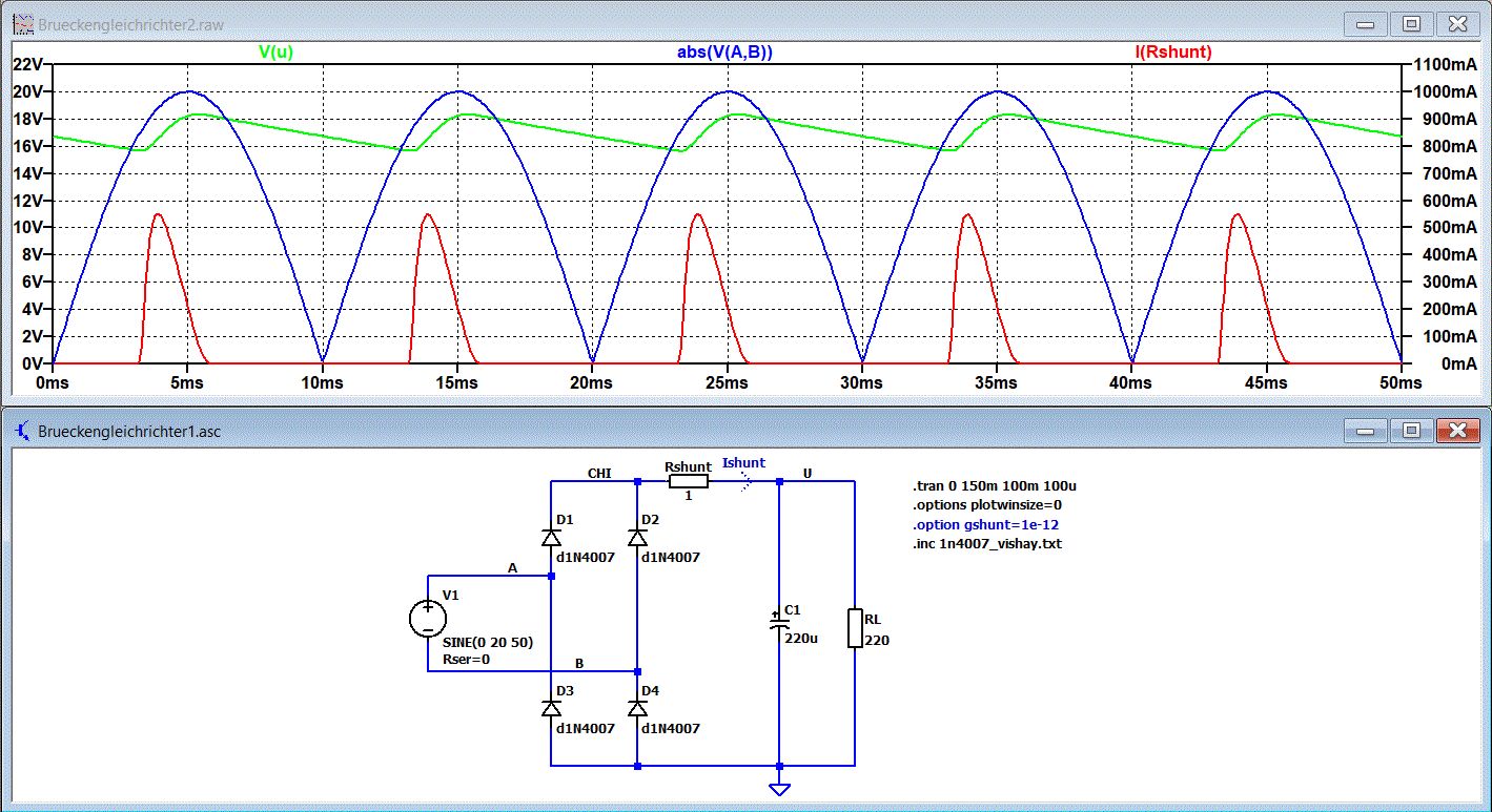 Hier mal zum besseren Verständnis zwei Simulationen mit LTspiceXVII. V(A,B) ist die ideal gleichgerichtet Eingangsspannung. Immer wenn die Eingangsspannung größer als die Ausgangsspannung wird, leiten die Dioden. Es sind dann immer zwei Dioden leitend. Deshalb ist die Ausgangsspannung des Gleichrichters um 2*Diodenflussspannung niedriger als die ideal gleichgerichtet Eingangsspannung V(A,B) der Quelle. Gleichrichter0.asc: Schaltung wie in der Übung Gleichrichter1.asc: Leichter verständlich Im zip-File sind die Dateien für die Simulation mit LTspiceXVII.