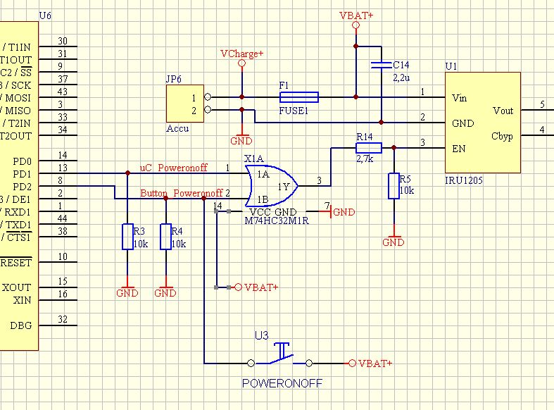 Ich habe das demletzt so geregelt: Mein Spannungsregler (IRU1205) besitzt einen power-enable (high-aktiv). Dieser Eingang wird von einem Oder-Gatter gesteuert, welches an einem Eingang einen Taster und am anderen Eingang einen µC-Pin hat. Der Taster kommt zusätzlich noch an einen µC-Pin (Eingang). Wird nun der Taster gedrückt, so aktiviert das Oder-Gatter den Spannungsregler und der µC startet. Dieser wartet nun 3 Sekunden bis er seinen Ausgang an das Oder-Gatter aktiviert. Wird nun innerhalb der 3 Sekunden der Taster losgelassen, so wird die Spannung wieder gekappt. Danach hält der µC das Oder-Gatter aktiv und somit die ganze Schaltung am laufen. Beim abschalten läuft es so, dass der µC 3 Sekunden lang einen High-Pegel vom Taster erwartet, bis er seinen Ausgang an das Oder-Gatter deaktiviert und somit die Spannungsversorgung beim loslassen des Tasters getrennt wird. Vorteil dieser Schaltung: Der µC weiß, wann er seine Versorgung gekappt bekommt und kann vorher noch evtl. erforderliche Aufgaben abarbeiten erst danach die Versorgung kappen. Ausschitt aus der Schaltung im Anhang! Grüße Kai
