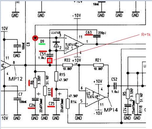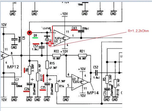 Der 1k-Widerstand wäre dann zwischen C51 und Pin 2 des OP einzufügen? Welche Funktion hat dieser Kondensator C63? Und was hätte sich, wahrscheinlich durch die Alterung der Platine, geändert, dass so ein Widerstand notwendig wäre? Ich hatte jetzt auch schon daran gedacht, einen kleinen Kondensator zwischen Pin 3 des OP und Masse einzufügen, um so den Schraubenzieher nachzubilden. Aber da ist mir unklar, wie groß/klein dieser sein müsste und ob das nicht irgendwelche negativen Auswirkungen hätte. Mal sehen, ob ich morgen etwas Zeit habe, um den Vorschlag mit dem Widerstand auszuprobieren.
