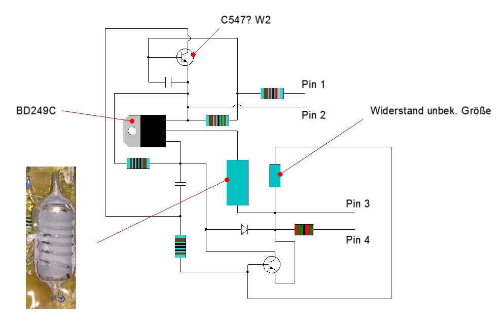 Das graue ist ein Leistungswiderstand vermitlich so um 1-2W Wenn Du die beiden unbekannte Größen malmit dem Ohmmeter misst, dann könnte ich ein "übersichtlicheren" Schaltpaln & Layout machen. VG Jörg