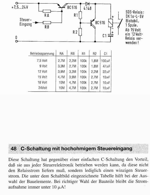 Hi, habe einen Eltako für den Wecker einmal aufgebaut. Dabei wird das Relais über ein Steuerrelais angesteuert. Das Steuerrelais ist direkt im Kollektorkreis des Steuertransistors, das "Differenzierglied" in der Transistorstufe davor. Das hat den Vorteil, dass der Kondensator wesentlich kleiner ausfällt. Mit 4,7 µF kam man da schon hin. Und ein hochohmiger Entladewiderstand parallel. Hat auch den Vorteil, dass bei Anschalten der Versorgungsspannung "nichts" passiert. Der Elko ist ja entladen und zieht sozusagen die Basis des zweiten Transistors nach GND. Transistor gesperrt. ciao gustav