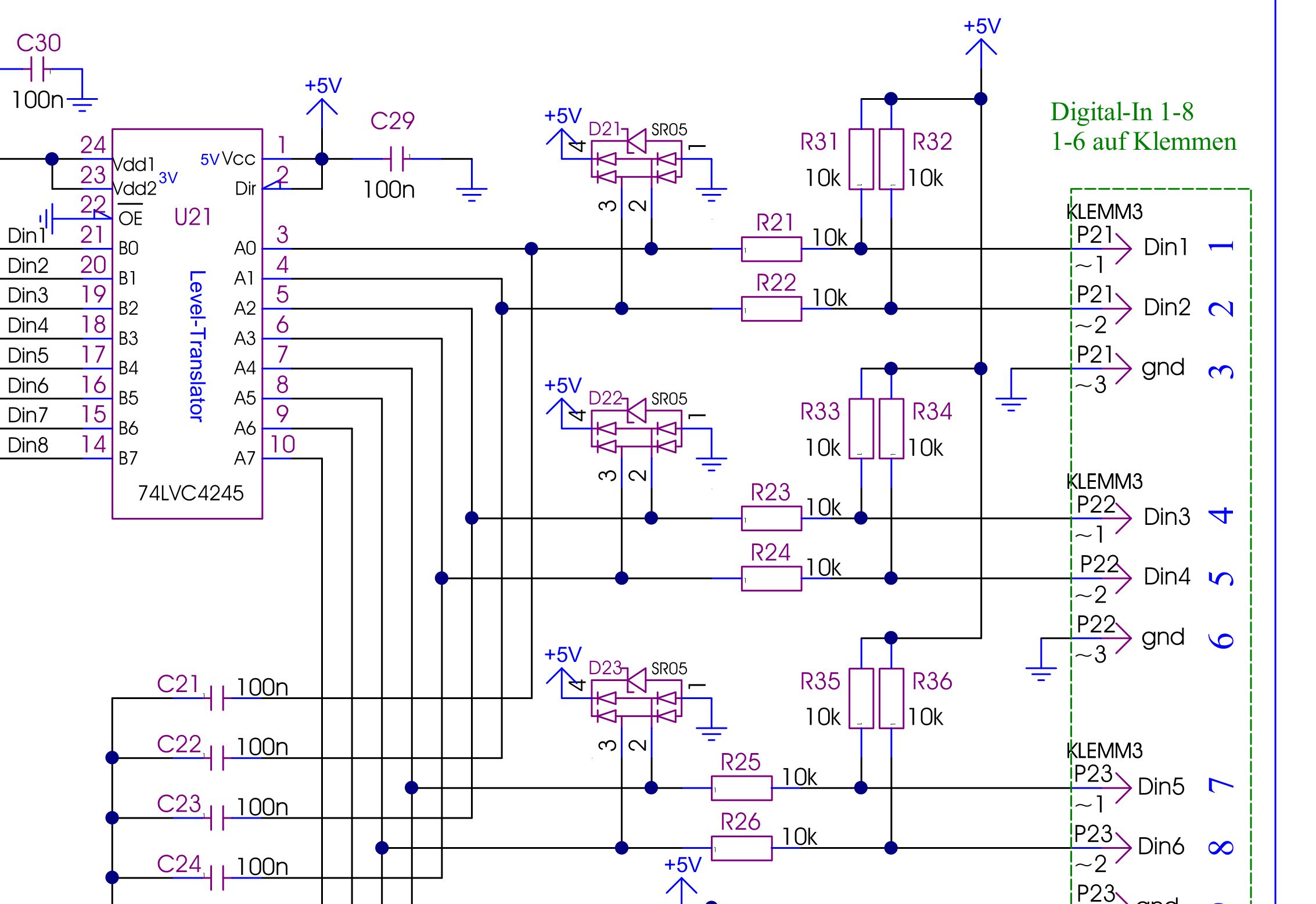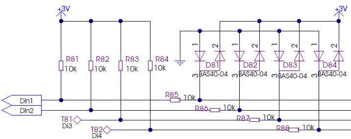 Hallo in die Runde, aktuell suche ich nach einer eleganten Lösung für folgendes Problem: Auf meiner Platine muss ein digitaler Eingang her, der low aktiv und zugleich kompatibel mit 24V Signalen und 5V TTL ist. Aktuell habe ich dafür einen 5V Eingang mit Pullup, sowie Serienwiderstand mit Dioden nach 5V und von GND zu Signal. Legt man nun ein 24V Signal an, wird die logische 0 zwar erkannt, aber es greift eben immer der Überspannungsschutz. Hat jemand eine Idee bzw. einen Ansatz? Vielen Dank für eure Mühe! Gruß, Tony
