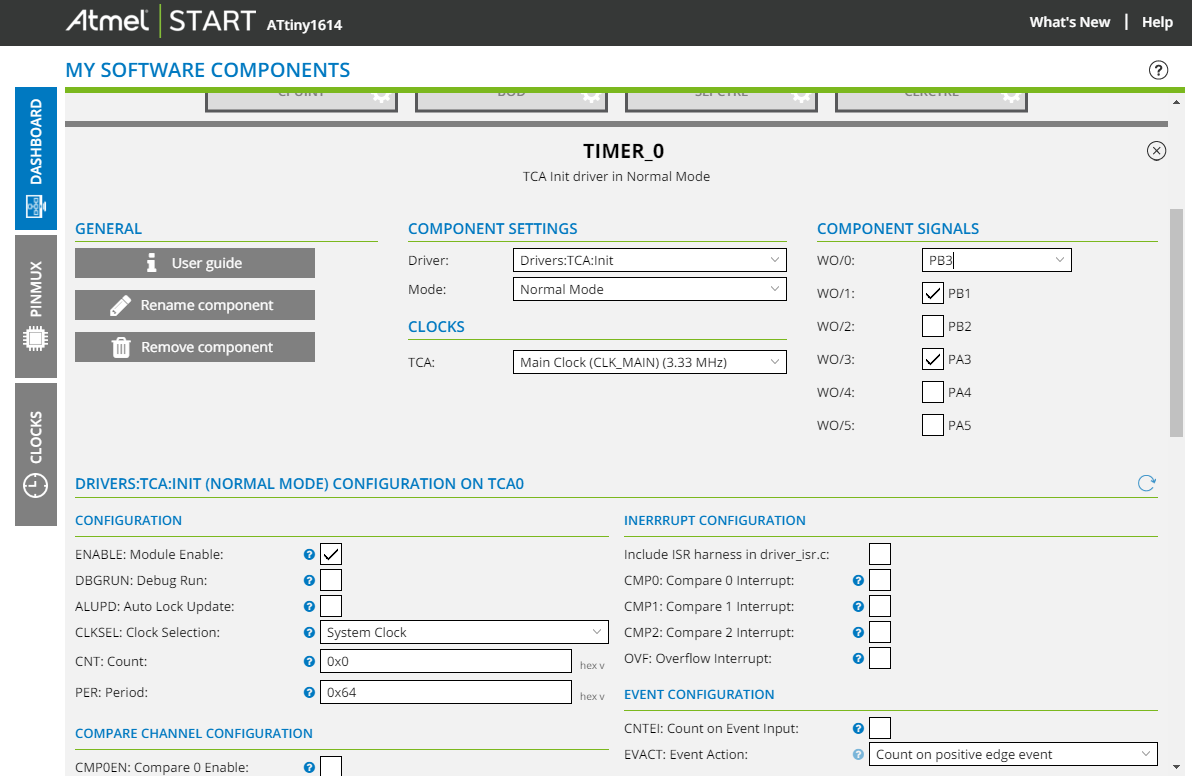 Hallo zusammen, irgendwo habe ich wahrscheinlich eine Knoten, hoffe Ihr könnt mir helfen diesen zu lösen. Nach meinem Verständnis, so stellt es auch der Codegenerator unter AtmelStart dar, kann man für einen PWM auch einen Port benennen. Die Zuordnung findet über WO/n statt. Nirgends finde ich wie/wo in welchem register dies konfiguriert wird. Auch in den generierten Sourcecode völlige Leere. Im Datenblatt 20.2.2 + 3 steht was von WO[5:0], in Figure 20-2 ist auch anschaulich gezeigt das WO/n als WaveformOutput genutzt werden kann. Stehe da gerade voll auf dem Schlauch. Hat jemand einen Tipp ? Gruß, Thomas