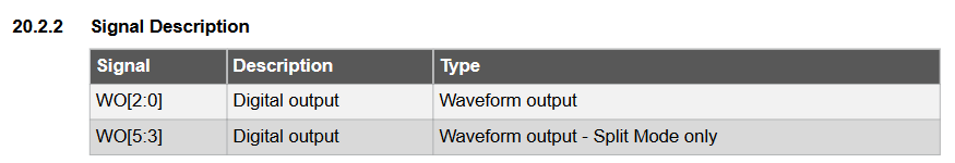 So, jetzt habe ich mir das selbst gelöst, korrigiert mich bitte sollte ich falsch liegen. Datenblatt 20.2.2 bedeutet das es eine feste Zuordnung vom CMP0-2 zu WO0-2 im Normal Mode gibt, und WO3-5 im SplitMode verwendet werden. Bei TCB und TCD dann enstprechend. Auweia, wen man einmal in der falschen Richtung unterwegs ist :) Hoffe dieser Beitrag hilft dem nächsten der sich darüber verstolpert. Gruß, Thomas