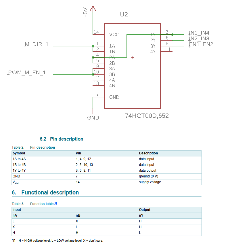 Die 100k sind schon verdammt hochohmig, besonders für das PWM-Signal. Die 500R könnten zum Ausgleich ruhig 10mal hochohmiger werden. Aber das ist alles egal, weil ein 74HCT00 (mit T) die Transistoren und die Widerstände drum herum ersetzen kann. Der bekommt die 5V-Versorgung vom L293 und hat Eingänge, die zu den 3.3V vom STM32 passen. Zwei Widerstände an PWM_M_EN und M_DIR braucht man trotzdem noch, damit die Signale auch dann stabil sind, wenn der STM32 gerade programmiert wird oder während Reset. Je nachdem, was der Motor dann machen soll, müssen das Pull-Up und/oder Pull-Down werden.