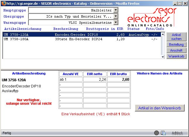 Keine Ahnung was bei mir anderst ist. Aber bei dir gibts wohl ein Problem. Warum stehen bei Dir UM... IC's bei V? Und warum dann nur die zwei? In der Rubrik wo diese UM... bei mir stehen gibts noch mehr davon. Ich öffne den Katalog direkt mit folgendem Link: http://cgi.segor.de/user-cgi-doc/Katalog/p15.shtml Auch das öffnen des Katalogs auf herkömmliche Weise bringt bei VLSI die 3 Typen.