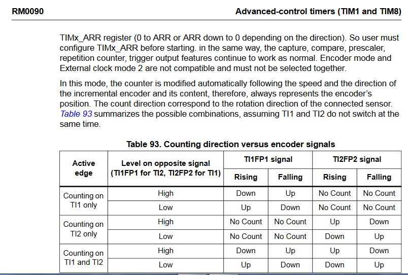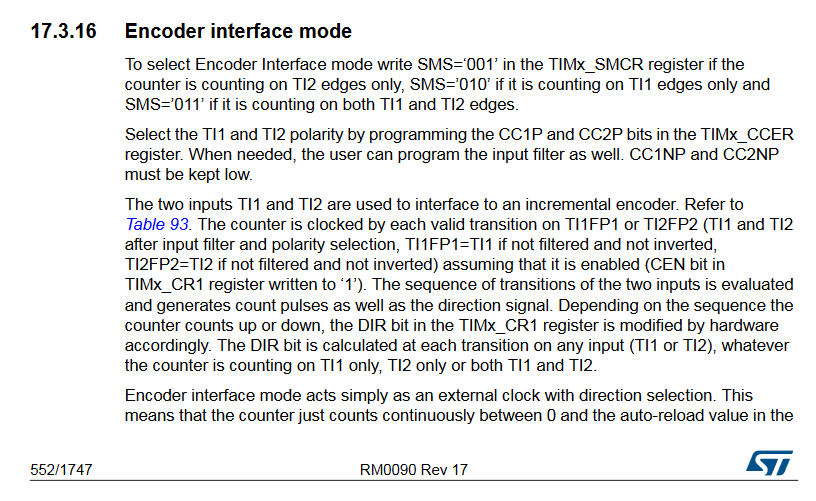 Hallo, Achtung Anfänger! ;) Ich möchte einen Timer-Interrupt auslösen immer genau dann, wenn eine bestimmte Anzahl Flanken von 2 digitalen Quadratursignalen eines Drehgebers gezählt wurden. Das STM 32F407 bietet genau für diese Anwendung eine Timer-Funktion "Encoder" mit 2 Eingängen an. (Dokumentation siehe Anhang)... Laut der Doku wird ja hier ein Auf-und Abwärts-Zähler generiert (je nach Drehrichtung), der sich nach Durchlauf des benutzerdefinierten Werts im TIMx_ARR -Register immer wieder zurücksetzt. Da ich mit CubeMX konfiguriere, habe ich bei den Timer-Optionen nur die Auswahl den Prescaler und die Counter Period auf einen Wert einzustellen. Daher zwei Fragen: 1. Ist Counter Period der Eintrag ins TIMx_ARR? 2. Müssen sonst wirklich keine weiteren Einstellungen bei den Clock Configurations und dem Prescaler gemacht werden? Als ich mich mit den Timern vertraut gemacht habe, bin ich nämlich immer auf folgende Formel gestoßen TIM= clock/((Prescaler+1)*(Period+1)) werden diese Einstellungen bei signalgesteuerten Timern nicht benötigt?
