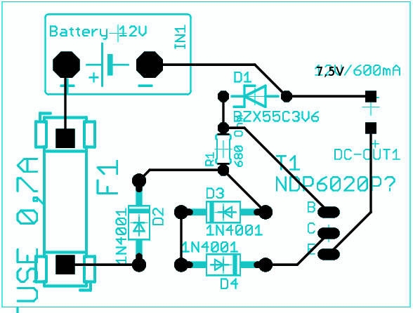 Mit einer 3,6V-Z-Diode kommt da etwa 3V raus (immer etwa 0,6V weniger als die Z-Spannung), sofern das ein normaler Transistor ist und kein Darlington. Ein NDP6020 ist es sicher nicht. Prinzipiell stimmt die Schaltung, aber sie hat keine Strombegrenzung (außer der Sicherung aber die sind geduldig) und auch sonst keinen Schutz, z.B. gegen Überhitzung. Das könnte ein Problem sein, denn an den beiden Dioden und dem Transistor geht die Differenzspannung ab, zusammen mit dem Laststrom sind das schon ordentlich warme Sachen. Nur mal 12V angenommen, kommt da bei 100mA schon ein Watt zusammen. Ein ungekühlter TO220 wird da schon "autsch" heiß. Und du musst ja evtl. mit höheren Umwelttemperaturen rechnen, ebenso wie höheren Strömen. Etwas mehr als 100mA und der Transistor wird abrauchen.