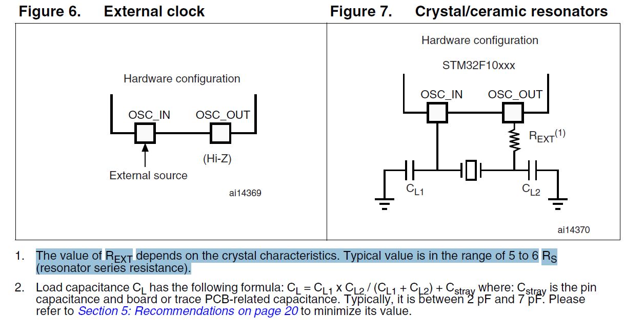 Guten Abend, ich möchte bei meinem Nucleo Board F103RB den HSE Takt aktivieren. Nun laut Datenblatt muss ich R35 und R37 auflöten. Im der App Note AN2586 steht das "The value of REXT depends on the crystal characteristics. Typical value is in the range of 5 to 6 RS (resonator series resistance)." Im Datenblatt des Quarz das ich habe finde ich aber nicht diesen resonator series resistance. Habe von Reichelt dieses Quarz 8,0000-HC49U-S Gibt es hier eine Wert der immer passt? Im Datenblatt des STM32F103 ist nur ein Widerstand in Serie zu OSC-Out Was ist richtig? Danke für das Licht ins Dunkel