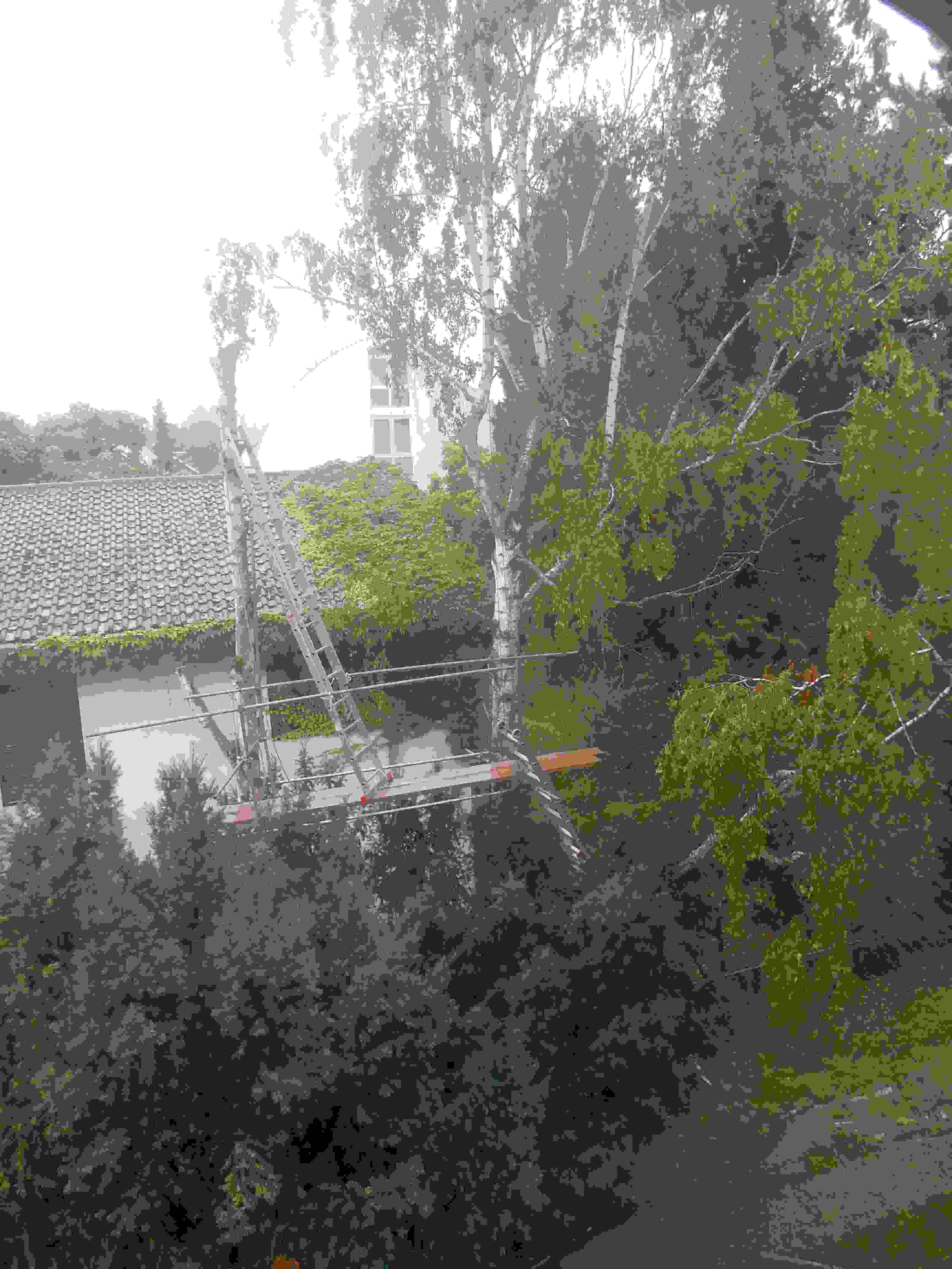 In Erwartung eines Youtube-tauglichen Absturzes? Wieviele Follower bekomme ich dann? Zum Glück gibt es nur ein Nachbarhaus mit Einsicht in den Garten (könnte auch mein Pech sein, wenn ich tagelang daliege). Da stand schon mindestens dreimal ein Gerüst, ich habe wie im Bild gezeigt genug "zöllich Rohr" und Gerüstverbinder dafür. So sah die rechte Birke noch 2021 aus, mit Blättern. Aber letztes Jahr folgte sie dem Beispiel der linken. Alle Leitern mit Seilen gesichert, ich bin nicht lebensmüde. Den linken Baum hatte ich damals noch etwa auf die Höhe der Bretter gekürzt, so steht sie noch heute. Und oben auf der linken Leiter habe ich wie schon geschrieben nur mit der Säbelsäge gearbeitet, dann habe ich noch eine Hand zum Festhalten. Und immer nur teilweise angesägt, den Rest mit einem langen Seil von unten aus sicherer Entfernung heruntergeholt. Den "impact" am Boden muss man natürlich bedenken, da darf nichts zerbrechliches liegen.