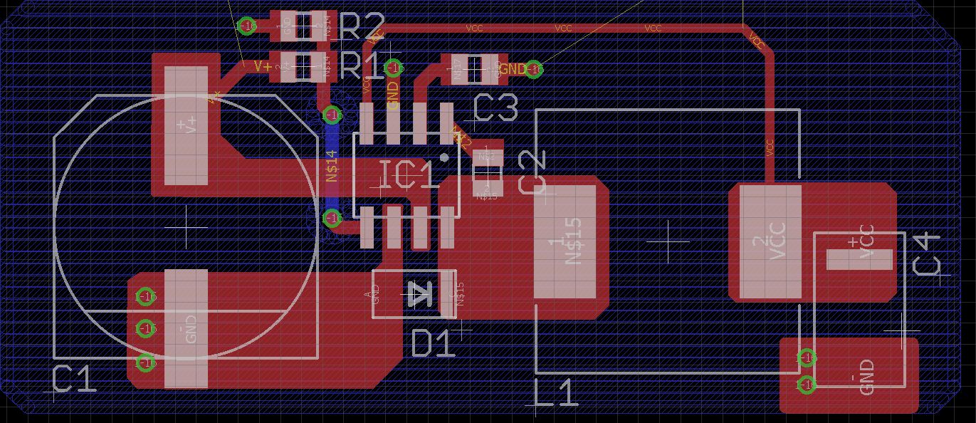 Ausgangselko: Hier empfehle ich entweder 3* MLCC 10uF mit mindestens 16V (DC-Bias-Problem) und natürlich X7R oder X5R oder besser einen Polymer-Elko, weil ja die Bauhöhe hier gar keine Rolle spielt. Panasonic 16SVPC39MV (39u/16V, 25mR, 2500mA, D5H6). Bei ILpp 250mA kann einen Ripple unter 10mVpp erwarten. PCB-Design: Na gut, die reinen IC-Verluste dürften 250mW nicht übersteigen, aber auch hier muss man bedenken, dass die Abgabe an die Umgebungsluft den Chip um mindestens 170/4= 43°C erhöht. Chiptemperatur bei 40°C Umgebung +43 sind 83°C. Ist noch kein Problem, aber wenn man mit einfachen Mitteln besser kühlen könnte, dann sollte man es tun. Haupterzeuger ist der Mosfet Schalttransistor und dessen Wärme wird am Besten über seinen Drain abgeführt, beim Switcher also VIN Pin 7. Jeder Quadratmillimeter an Kupfer an diesem Pin ist ein Vorteil !! Im vorliegenden PCB-Design gibt es zwar eine dickliche Leiterbahn zum C1, wird aber von diesem weitgehend abgedeckt. Eine Konvektion kaum möglich. Vielmehr müsste man ein bisschen Fläche auf der "anderen" PCB-Seite spendieren. Und tatsächlich wird es auch gemacht im MAXIM EV Kit Design. Wenn man genau hinschaut: Pin 7 geht üner 2 Vias auf die Unterseite und hier eine breitere Leiterbahn zum C1, eben völlig frei liegend, gut für Konvektion oder ggfs sogar Montage auf ein Blech etc.