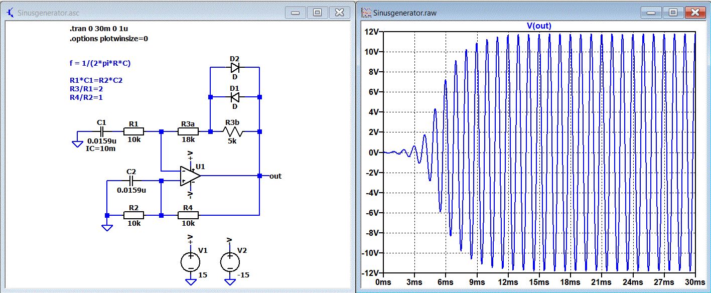 Ich hatte diese Schaltung nicht in Erinnerung. Vielleicht hatte ich sie auch noch nie gesehen. Ich habe dann mal schnell das Schweizer Taschenmesser (LTspiceXVII) ausgepackt und und losgelegt. Im Schaltplan stehen auch die Formeln die man beachten sollte, wenn man einen Oszillator damit bauen will. Die Dioden dienen zur Stabilisierung der Amplitude.