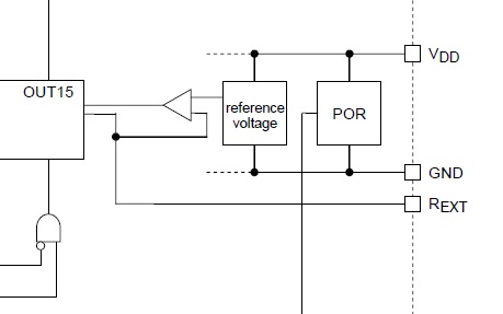 Hallo, ich möchte einen Toshiba TB62747AFNG zum treiben von LEDs nutzen. Der Strom der Ausgänge wird über einen Rext eingestellt. Die Formel laut Datenblatt lautet: Io = 1,13V / Rext * 14,9 So wie ich das sehe, verstärkt das IC den Ausgang vom Pin Rext immer auf 1,13V. Dann wird ein Strom durch 1,13 / Rext erzeugt, welcher mit dem Faktor 14,9 verstärkt wird. Meine Überlegung: Wenn ich nun eine Steuerspannung mit einem Spannungsfolger kombiniere und so das Bezugspotential vom Rext ändern kann, könnte ich über eine PWM den Strom steuern. Im Anhang ein kleiner Schaltplan. Es gibt noch keinen großen Schaltplan, daher wirklich nur dieser Ausschnitt. Die neue Formel wäre dann: Io = (1,13 - Ue) / Rext * 14,9 Stimmt meine Überlegung so? PS: Laut Blockschaltbild hängt der Pin Rext intern auch an dem Eingang eines Opamps, der andere an einer Vref Quelle (womöglich die 1,13V). Dhaer denke ich negatives Feedback und konstante 1,13V am Pin Rext.