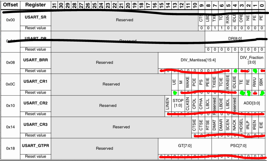 Ich hab mal ein Diagramm der Register im Anhang. Alle Bits die ich rot markiert habe sind auf 0 gesetzt, die grünen auf 1. Was mich stark wundert, ist dass CubeMX den Quellcode so generiert, dass das Bit UE im CR1 zum Enablen des UARTS auf 0 ist. Habe ich dann nachträglich selbst eingeführt. Ist irgendwas an den Registern auffällig? Die beiden mit schwarz durchgestrichenen zeigt mir der huart gar nicht an.