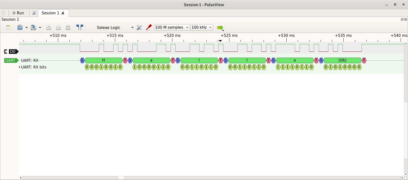 Alles andere hat CubeMX generiert. Dazu habe ich nicht viel machen müssen: - SYS Debugging via SWD - USART2 enabled, asynchronous 2400 Baud - USART4 enabled, asynchronous 2400 Baud - GPIO PA5 = output push/pull Alles Andere habe ich auf den Standardvorgaben gelassen. Das angehängte Bild ist vom Logic Analyzer, den ich mit PA0 (= USART4 Tx) verbunden habe. Folgende Software-Versionen habe ich verwendet: - CubeMX v5.1.0 - STM32CubeL0 Firmware Package v1.11.2 - System Workbench for STM32, alle Plugins heute frisch aktualisiert