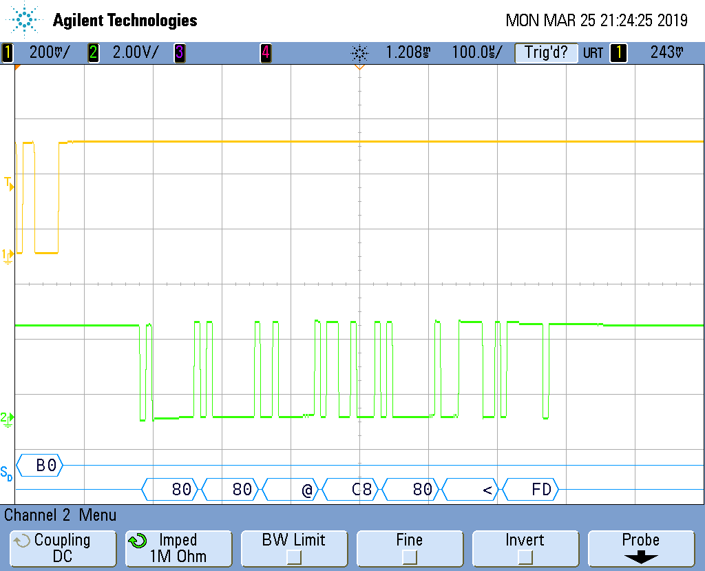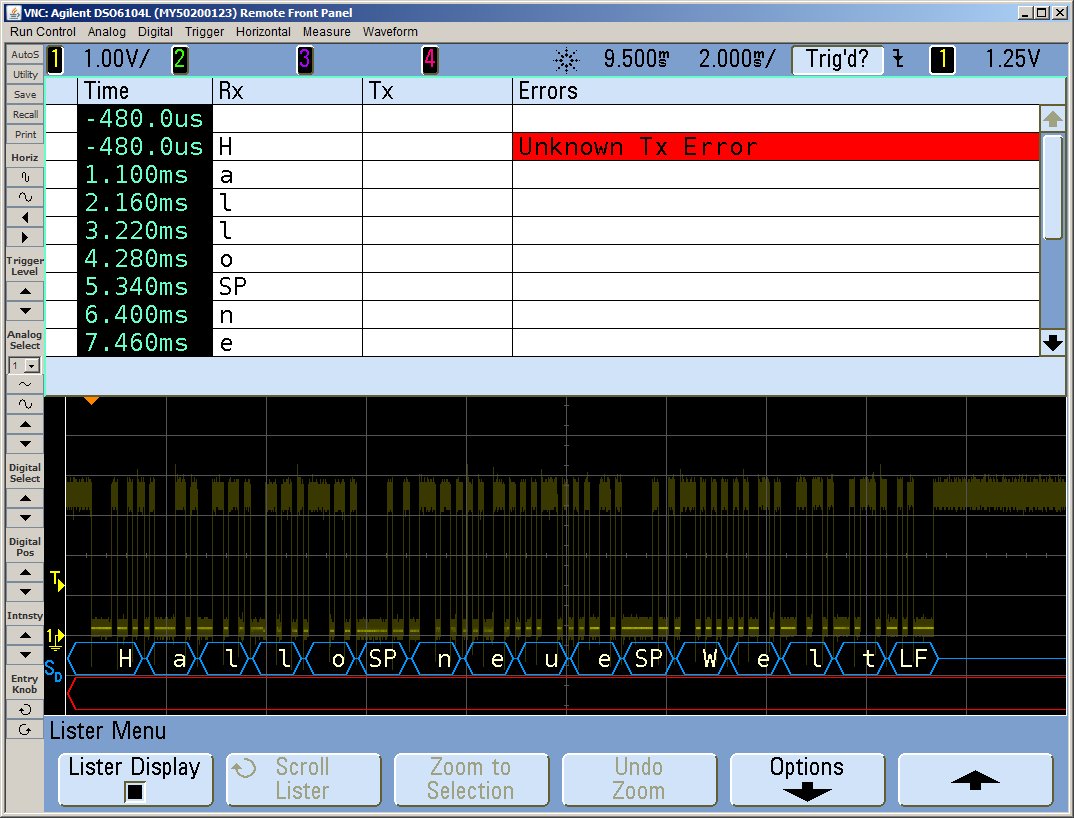 A. M. schrieb: > Nur leider komme ich nur ein flackern der RXT Leitung. Hexzeichen oder > der gleichen werden nicht angezeigt. Du könntest auf Single Shot stellen, dann flackert da nichts mehr und du kannst dir erstmal in Ruhe angucken, was du für ein Signal hast. Hast du schon mal ins Manual vom DSO5034A, um es passend einzustellen?