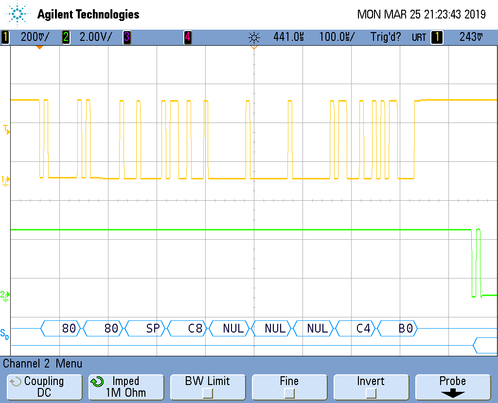 Hallo, ich habe ein Problem! Möchte gern die RS232 RXT und TXD Signale am Oszi abbilden. Nur leider komme ich nur ein flackern der RXT Leitung. Hexzeichen oder der gleichen werden nicht angezeigt. Bereiche an CH1 und Ch2 sind jeweils 500mV und Zeitbasis 1000ms. Hat jemand von euch ein ähnliches OSzi und kann mir hierbei nachhelfen?