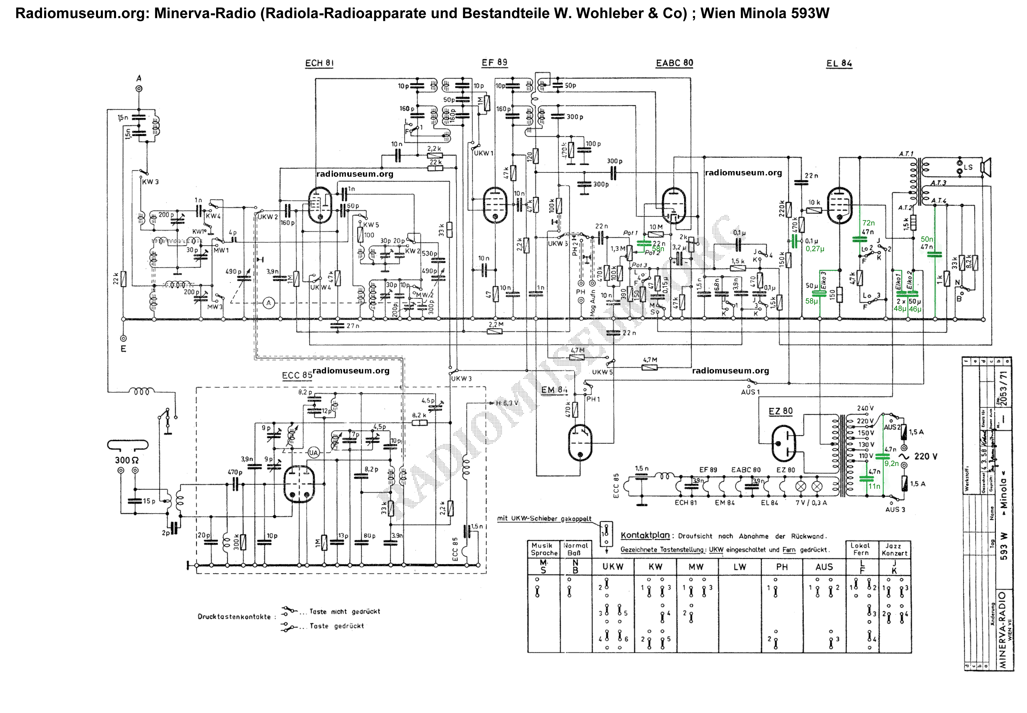 Danke für die ausführlichen und schnellen Antworten. Ich habe auf 240V Versorgungsspannung umgestellt, alle Elkos wieder eingelötet und alle Kontakte in der weißen Umrandung gründlich gereinigt. UKW funktioniert jetzt wunderbar. Es gibt auch kein Brummen, nicht einmal wenn das Gerät auf einer Frequenz ist auf der nicht gesendet wird. Leider habe ich die Verbindung von der mit dem Pfeil gekennzeichneten Induktivität zu "LW-Ferr" unabsichtlich unterbrochen. Dh. wollte ich vorsichtshalber noch nicht LW testen. Ich werde den 22nF Kondensator an der Anode der EABC80 tauschen und die genannte Induktivität wieder verbinden. Zum Post von Peter D hätte ich noch eine Frage. Kann ich einen mp3 Player oder ein raspberry am Phono Eingang mit guter Audioqualität betreiben oder braucht man dazu etwas dazwischen? Außerdem sind anbei die Audioaufnahmen VOR der Kontaktreinigung