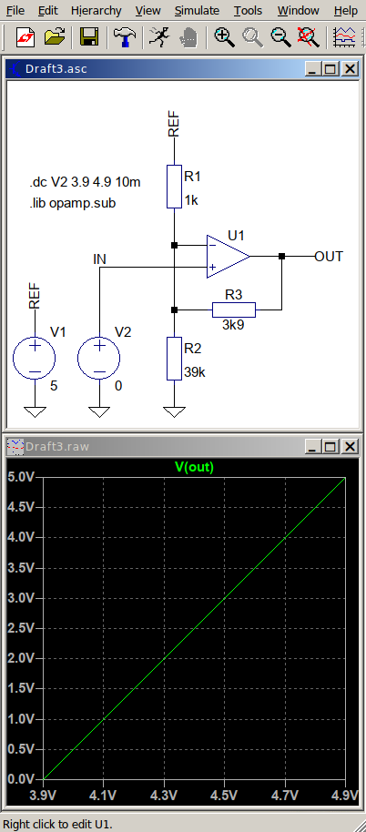 Sind die Versorgungsspannungen des Opamp gleich Uref und 0V, muss der Opamp ein ein Rail-to-Rail-Typ sein. Da dessen Ausgangsspannung nicht ganz an die Versorgungsspannungsgrenzen herankommt, solltest du U_L und U_H etwas großzügiger auslegen. Im Beispiel bin ich von Uref = 5V, U_L = 3,9V ⪅ Uref · 800/1024 und U_H = 4,9V ⪆ Uref · 1000/1024 ausgegangen. Die Schaltung kann aber für beliebige 0 ≤ U_L ≤ U_H ≤ Uref dimensioniert werden.