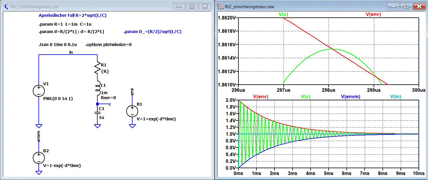 Helmut S. schrieb: > Die Einhüllende hat den Faktor > > e^(-(R/(2*L))*t) Hier mal eine Simulation mit dem kostenlosen Programm LTspiceXVII von www.analog.com. In dem oberen Plot sieht man, dass diese Einhüllende die Spitze der sindusförmgen Schwingung schneidet.