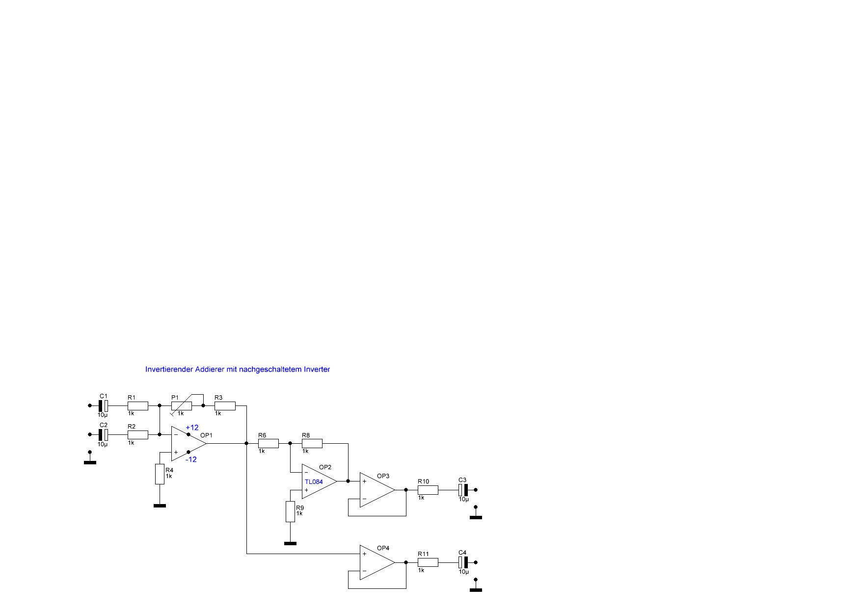 Hi, ich glaube, am Minus-IN heben sich die Ströme auf (Nullstrom-Knotenpunkt oder so). Deshalb geht nur der invertierende Addierer gut. Du könntest einen invertierenden Addierer aufbauen und dann noch mal einen invertierenden OP nachschalten, dann stimmt die Phase wieder (dann sind aber zwei OPs verbaut statt einem). Bei deiner Beschaltung wie oben gezeigt hingegen liegen die Eingangswiderstände 1k quasi parallel, wenn niederohmige Quellen angeschlossen sind. Dadurch werden die Eingangssignale stark bedämpft (sie bedämpfen sich sozusagen gegenseitig - am Plus-IN existiert nämlich kein Nullstrom-Knotenpunkt).