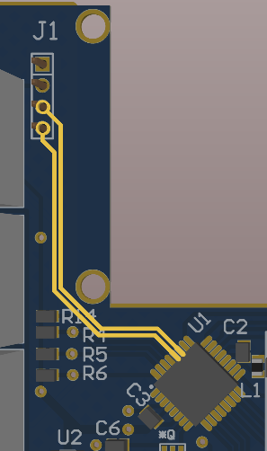 Wolfgang schrieb: > D a v i d K. schrieb: >> Aber das Trägerboard für das Display kommt mit 4K7 daher: > > Das ist arg viel. Guck dir mal die Signale an und halbiere ggf. den > Pull-up- Angeblich ist das Pulldown der Mosfets doch unproblematisch? > Wie groß ist die Fläche, die deine SDA/Gnd bzw. SCL/Gnd Leiterschleife > einschießt? Sind die Kabel verdrillt? Ich habe kein Kabel. Der Weg ist so gering, dass ich die Boards direkt mit Headern verbinde. Sehe gerade, dass ich mit Fast TWI arbeite (400kHz) werde es mal heute Abend mit Std. (100kHz) probieren, oder sollte dies nicht "robuster" sein? Leiterbahnen siehe Bild (J1 ist die Lötverbindung zum Display (ginge auch zu stecken ist aber verlötet)