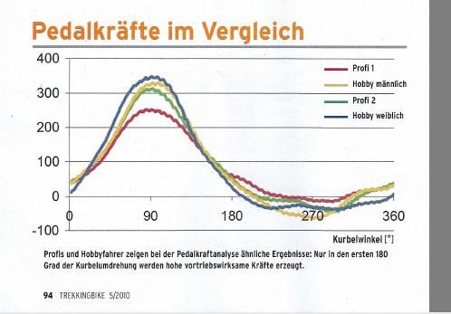 A. S. schrieb: > o-o schrieb: >> Bild aus Trekkingbike_09_2010 >> >> > http://www.radlabor.de/fileadmin/News/PDF/Trekkingbike_09_2010_-_Der_Runde_Tritt.pdf > > mir ist nicht ganz klar, was die Ordinate (Y-Achse) aussagt. > > ... > > Vielleicht Newton? Also bei grob 0.2m Kurbel dann ~18Nm im Mittel, ~60Nm > Maximum, je Pedal? Vermutlich ja, in ähnlichen Diagrammen, wie bspw. hier http://www.bisp.de/SharedDocs/Downloads/Publikationen/Jahrbuch/Jb_200708_Artikel/Wolff_191.pdf?__blob=publicationFile ist es die Kraft – genauer: die Tangentialkraft – in Newton.