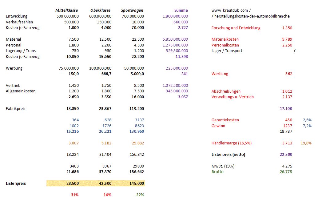 Nach der Tabelle ist ein kleiner Audi rund ein Drittel teurer, als er eigentlich sein müsste und das nur, um die aufwändige Audimaschinerie zu bezahlen, mit der dann die Oberklasse und der super Sportwagen finanziert wird. Die Allgemeinkosten, die mit über 2.000 pro Auto angesetzt sind, beinhalten auch die Rennsportserien, an denen die Hersteller teilnehmen.