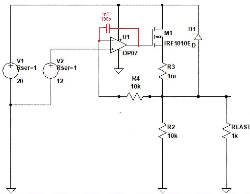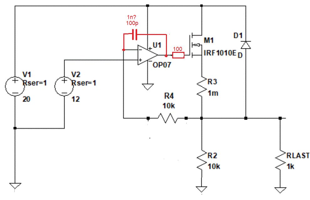 Ich hatte noch den 100Ohm Serienwiderstand vergessen. Opamps mögen keine größeren kapazitiven Belastungen am Ausgang. Da Power-Mosfets relativ hohe Kapazitäten haben, schaltet man z. B. 100Ohm in Serie. Im Datenblatt des OP07 steht mindestens 50Ohm.