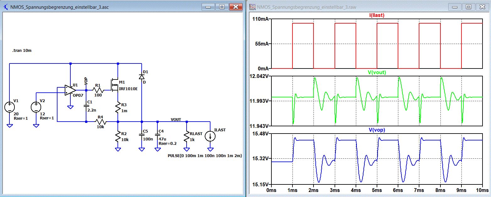Stromberg B. schrieb: > Das kann sich schon sehen lassen. Aber wie sähe die Lastkurve aus, wenn > der 2n2 direkt parallel zu R4 geschaltet würde? Damit könnte man dann > das ganze System mit dem 2n2 gegenkoppeln und nicht nur den OPV. Genau das will man ja nicht haben. Die Simulation hier funktioniert auch mit R4=0Ohm und ohne C1(2.2nF), aber das liegt an dem Rser=0,2Ohm des 47uF Kondensators und eventuell zusätzlich an dem zu idealisierten Opamp-Modell. Mit einem guten 47uF keramischen Kondensator(Rser=10mOhm) schwingt die Schaltung, wenn man R4=0hm wählt und C1 weglässt.