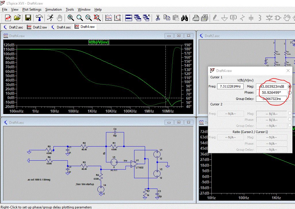 Hallo, ich dachte, ich sollte so fair sein mal feedback zu geben. Man findet ja doch sehr sehr wenig im Internet darüber allgemein. Ich denke ich habe die AC Simulation falsch gemacht. Ich habe in den untiefen des Netz die Empfehlung gefunden, dass man zur AC Simulation den Loop geschlossen halten sollte im Schaltbild und stattdessen an der Rückkoppelstelle die AC Quelle reinbaut. Der Open-Loop Gain und die Phase ergibt sich dann aus der Division zwischen den zwei Punkten vor- und nach der AC Quelle. Als delay habe ich jetzt 5 us mal genommen (worst-case delay bei 200 kHz PWm frequenz je nach duty-cycle) Mit dem 0dB Punkt bin ich nach bisschen probieren auf ca. doppelte Audiofrequenz rausgekommen (45 kHz) und habe da jetzt 25° Phase Margin. Ich werde jetzt mal ne PCB designen und das ganze aufbauen - mal sehen. Das ganze kann man in den Dateien loop_ac.gif und Draft2.asc sehen. Die Stabilität von dem Diff-Amp musste ich auch nochmal prüfen da er in der Transienten-Simulation geschwungen hat. Habe da jetzt auch nochmal ein 10 pf zur Kompensation drinnen. Siehe die anderen zwei Dateien. Da bin ich jetzt bei 7.2 MHz mit ca 50° phase margin. Den DC Bias den ich hatte (will ja alles mit nur single-supply aufbauen) habe ich in den AC Simulationen mal außen vor gelassen und so simuliert als ob ich symmetrische Supply hätte. Sollte auf das AC Verhalten hoffentlich keine Auswirkung haben. Hoffe das hilft irgendwann mal jemanden. Bye