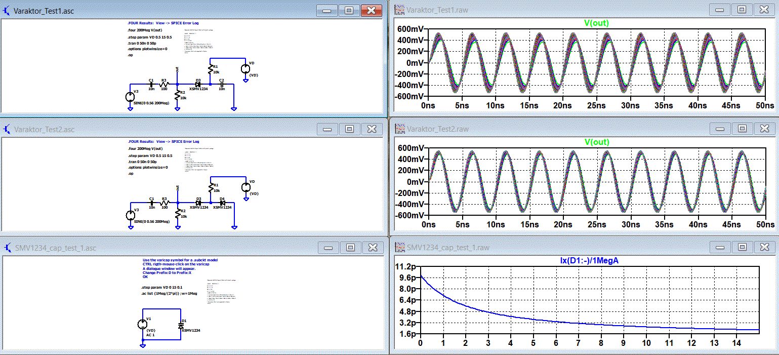 Hier die Simulationen. Beachte, dass die Gesamtkapazität von zwei Dioden in Serie nur halb so groß ist. Den Klirrfaktor habe ich mit .FOUR berechnen lassen. Die Ergebnisse des Klirrfaktors stehen im Log-File. View -> SPICE Error Log