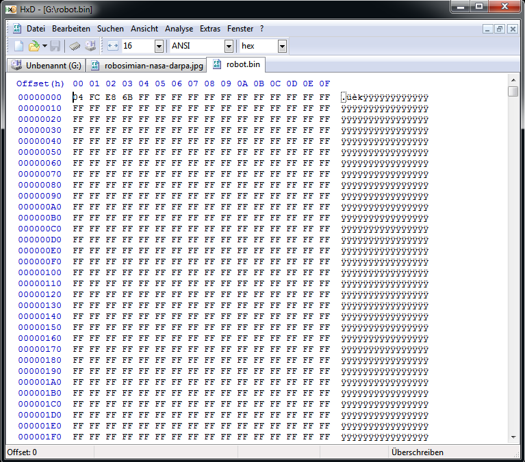 Hallo, ich habe ein JPG-Bild (siehe Anhang 1) in Binär-Datei mit einem Tools konvertiert und in eine 2GB SD-Karte kopiert. Jetzt möchte ich wissen, wo genau (also ab welcher Addresse oder ab welchem Sektor) meine Binärdaten in der SD-Karte liegen, um diese mit meinem FPGA-Board über SPI zu lesen. Dazu nutze ich den HxD-Editor. Damit kann ich die SD-Karte und die Datei öffnen, um den Inhalt in HEX-Daten zu sehen. Im Anhang 2 ist der Inhalt des ersten Sektors (0) der SD-Karte zu sehen und im Anhang 3 sind die ersten 512 Bytes der Binär-Datei zu sehen. Die SD-Karte ist mit dem Dateisystem FAT16 formatiert. Ich freue mich auf eure Hilfe. Vielen Dank!