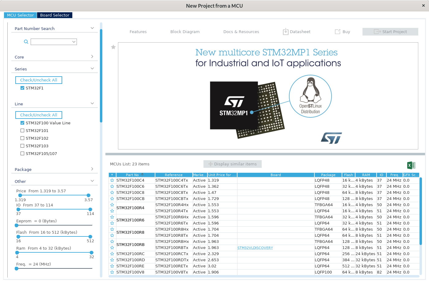 Auf dem Board ist nicht viel spannendes drauf, deswegen kannst du einfach den STM32F100RB auswählen.