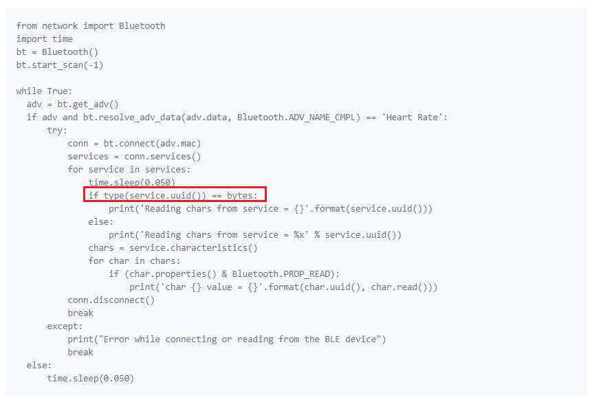 Hi, hat von euch schon mal mit dem Pycom Modul "LoPy" eine Bluetooth Verbindung aufbauen können? Ich versuche gerade den angehängten Beispielcode aus der API zum Laufen zu bringen und habe dazu auch eine Frage. Was passiert im von mir rot markierten Bereich? MfG