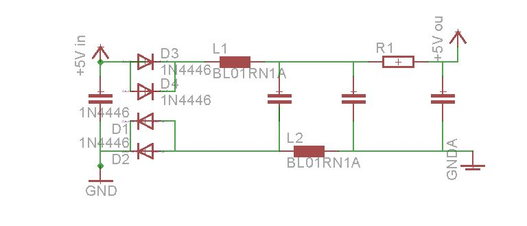 Hallo zusammen =) Ich hab diesen Schaltplan aus meinem Fundus ausgegraben, der Beschreibung nach sollte das ein Netzfilter für Gleichstrom sein. Zu dem Problem ich nutze einen Kopfhörer welcher mit 5V aus einer USB Buchse des selben Rechners versorgt werden soll. Wird der Kopfhörer wie geplant angeschlossen gibt es ein Störgeräusch welches von der Grafikkarte auszugehen scheind. Wird der Kopfhörer allerdings per Powerbank mit Strom versorgt ist alles störungsfrei. Meine Vermutung ist also das ich unsaubere 5V aus der USB Buchse bekomme, die man hoffentlich filtern kann. Zu dem Schaltplan, der ist aus meinem fundus und wenn er funktioniert wäre es sehr nett wenn mir jemand erklären kann wie bzw welche dimensionierung die bauteile haben sollten. Ich denke mal mehr als 500 ma wird nicht durch laufen.
