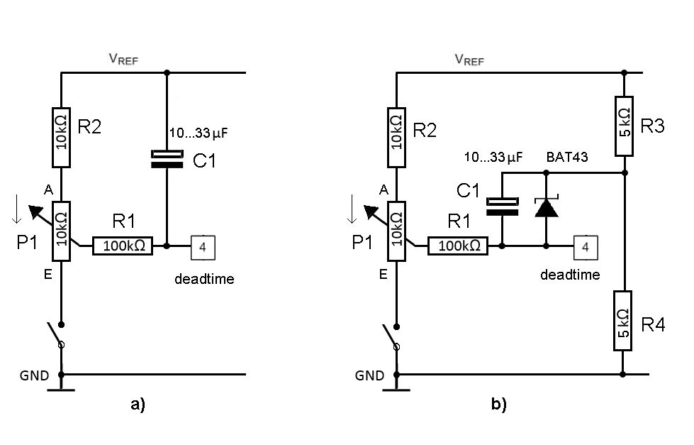Man kann beide Funktionen über den deadtime-pin steuern. Schaltung a) zeigt das Prinzip C1, R1 (und anteilig P1) bestimmen die Dimmzeit (Hoch- und Runterdimmen). Mit P1 stellst du den gewünschten Duty Cycle (Leuchtstärke nach Hochdimmen) ein. R2 bewirkt, daß der gesamte Poti-Drehbereich genutzt werden kann. Die PWM startet erst, wenn C1 auf ca. 1/2 Uref aufgeladen wurde. Es gibt also eine Verzögerung, bis es losgeht. Dies vermeidet Schaltung b) R2, R3 oder R4 können ggf. angepasst werden Mit dem Schalter wird das Hoch- bzw. Runterdimmen geschaltet. Der Schalter darf auch ein Transistor sein. Der mir gelieferte TL494 trabt übrigens auch mit 100 Hz gutmütig vor sich hin.