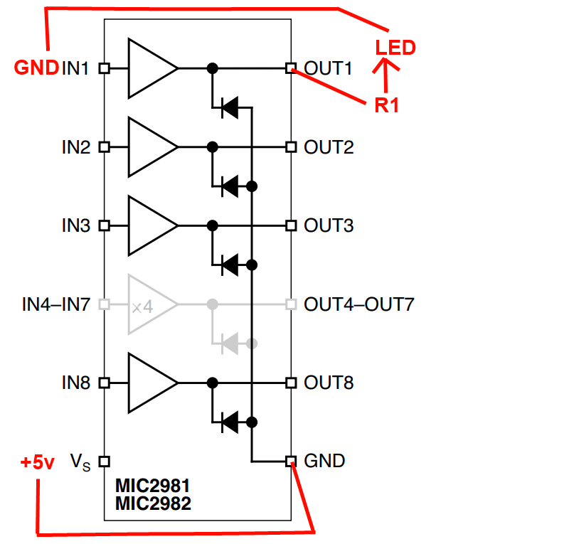 Hallo Leute, ich habe ein Verständnißproblem mit dem MIC2981: Die LED leuchtet auch wenn ich die Verbindung GND -> IN1 trenne. Mir ist klar das ich da noch einen Fehler habe, nur wo? Anstelle der LED soll später ein Relais damit geschalten werden Gruß Jochen