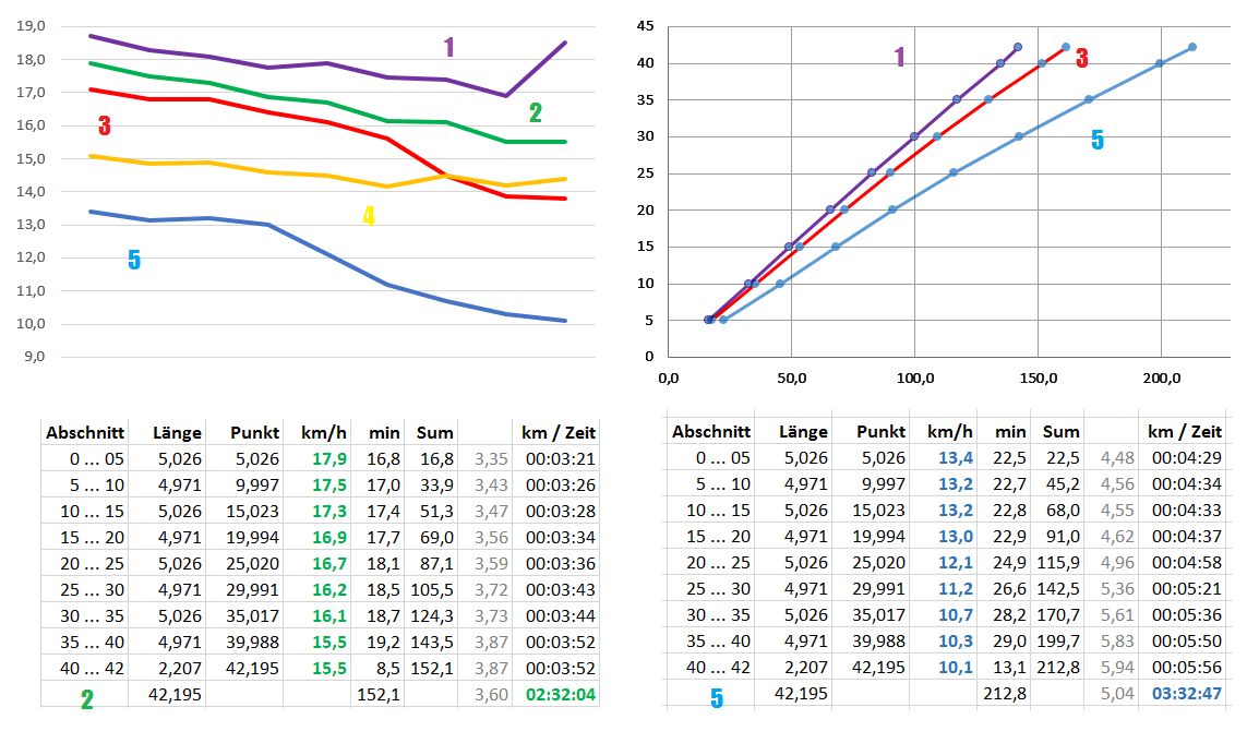 thomas_m schrieb: > Freier Wildbahn --> Triathlon, Wasser..., Wechselzone ??? In der Wechselzone hat es in der Regel eine (redundante) Messeinrichtung, die zumindest das Problem der Nichterfassung löst. Oftmals ist es auch so gelöst, dass einlaufende /-fahrende Athleten und rauslaufende über dieselbe Matte gehen. Im Wasser wird es schwierig. Wer will da die Bojen mit den Lesern justieren und erfassen? Entweder man nutzt die Triauhren der Wettkämpfer mit deren GPS (Erkennung der Wendemarken) oder man muss mit Kameras arbeiten. Ich halte den Wunsch, die Daten so detailliert zu erheben aber wegen der o.g. Problematik der Interpretation nicht zielführend. Hier mal ein konkretes Beispiel zu den Geschwindigkeiten beim Marathon: Der blaue mit den 3h32 ist relativ wenig trainiert und kann sein Zieltempo etwa 100min halten. Der gelbe (2h53) ist nicht einmal 2km/h schneller, packt aber das Tempo die gesamte Strecke. Das bringt ihm die Zeit. Da er hinten noch einmal zulegen kann, würde ich nun raten, dass er etwas zu langsam gelaufen ist und wahrscheinlich noch schneller könnte. Genaueres würde sein Pulsverlauf liefern, den ich aber nicht habe. Die rote Kurve des Läufers mit der Endzeit 2h41 zeigt es andeutungsweise, wobei der ein wenig zu stark einzubrechen scheint. Hat vlt. in der Mitte des Rennens zu lange versucht, das Tempo zu halten oder er trainiert nicht häufig genug die langen Strecken. Der Grüne ist wohl ziemlich an seinem Limit und fällt gleichmäßig ab, während der violette (der Sieger) trotz höherem Tempo sicher noch nicht am Limit war, sondern sicher das Tempo kontrolliert hat und sich erst am Ende gelöst haben dürfte. Von der Gesamtentwicklung der Zeiten geht mir das etwas zu sehr nach unten nach meinen Erfahrungen. Normalerweise sind die Geschwindigkeiten etwas glatter. Bei dem Rennen ist es aber nachvollziehbar, wegen der relativ hohen Temperaturen an dem Tag und dem überdurchschnittlichen Flüssigkeitsverlust. Der scheint besonders den unerfahrenen Läufern zugesetzt zu haben. Das Rennen wird nach hinten raus länger und länger (rechtes Diagramm, km über gelaufene Minuten). Die Frage ist, wie man das dann für sich jeweils interpretieren und auswerten will, was die Dosierung der eigenen Leistung angeht. Dass das Rennen insgesamt langsam ist oder wird, nimmt man ja eigentlich direkt wahr.