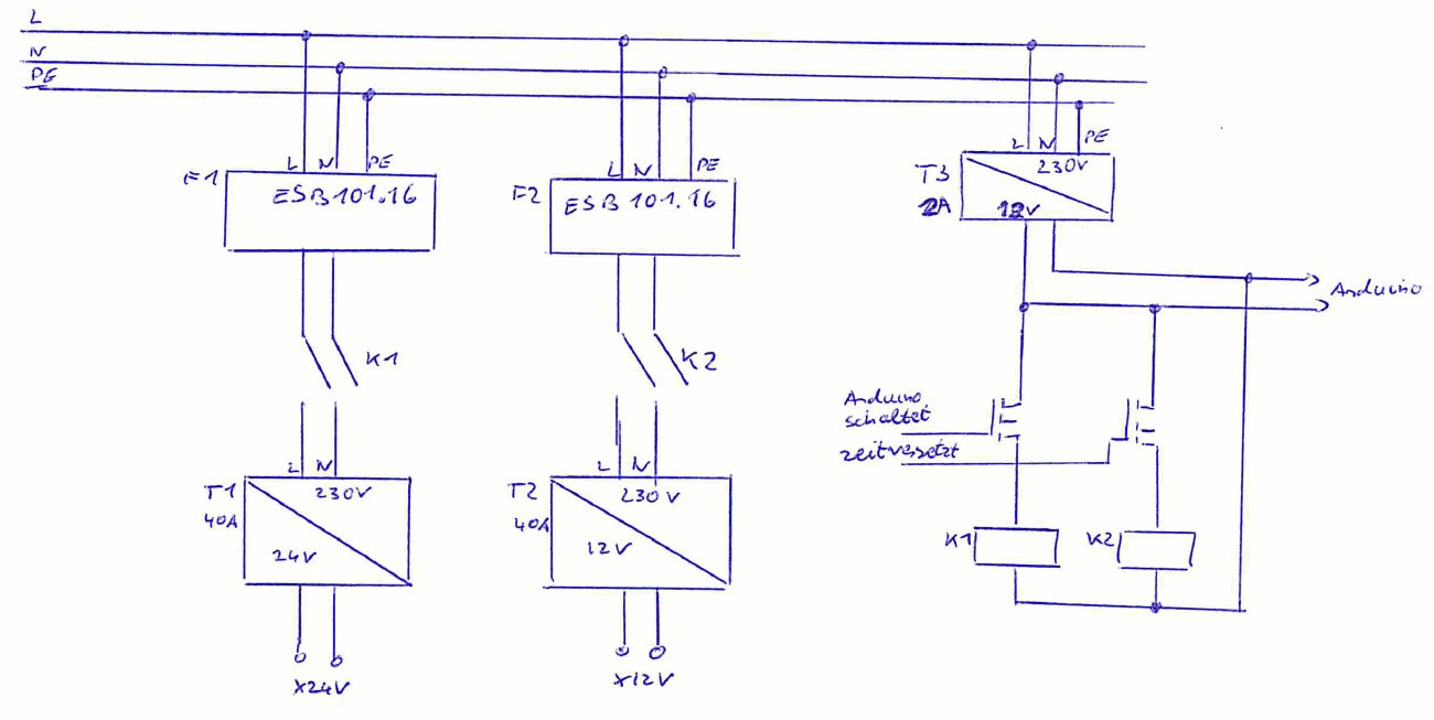 Hallo Leute, für einen Roboter, an dem ich herumbastele, brauche ich eine Stromversorgung, genauer: 12V und 24V. Dazu habe ich mir die folgenden Netzteile gedacht (noch nicht besorgt!) https://www.reichelt.de/schaltnetzteil-geschlossen-960-w-24-v-40-a-mw-rsp-1000-24-p147932.html https://www.reichelt.de/schaltnetzteil-geschlossen-450-w-12-v-37-5-a-mw-hrpg-450-12-p148034.html Die zur Verfügung gestellte Leistung werde ich derzeit noch lange nicht abrufen, aber ich will vorausplanen und nicht später Netzteile nachkaufen ;-) Der Einschaltstrom von 40A bzw. 70A würde allerdings sicherlich meinen B10 Haus-Automaten auslösen. Den Automaten kann, darf und will ich nicht wechseln! Es bleibt also nur eine Einschaltstrombegrenzung übrig. Dazu habe ich mir diese rausgesucht, die angeblich besonders für kapazitive Lasten (a.k.a. Schaltnetzteile) geeignet sein soll: http://camtec-netzteile.de/data-12/1/camtec_esb101_e062016-02-2.pdf Der ESB101.16 soll den Einschaltstrom auf 16A begrenzen uns ist ab B4 Automat geeignet, sollte also passen. Allerdings sind beim ESB101 maximale Kapazitäten angegeben, die von der nachgeschalteten Schaltung nicht überschritten werden dürfen. In den Datenblättern der MeanWell Netzteile findet sich eine solche Angabe jedoch leider nicht. Daher meine Frage an Euch: Hättet Ihr Bedenken, die Kombination so wie auf dem Bild gezeigt zu verwenden? Ich danke für Eure Hilfe. Grüße x12z34