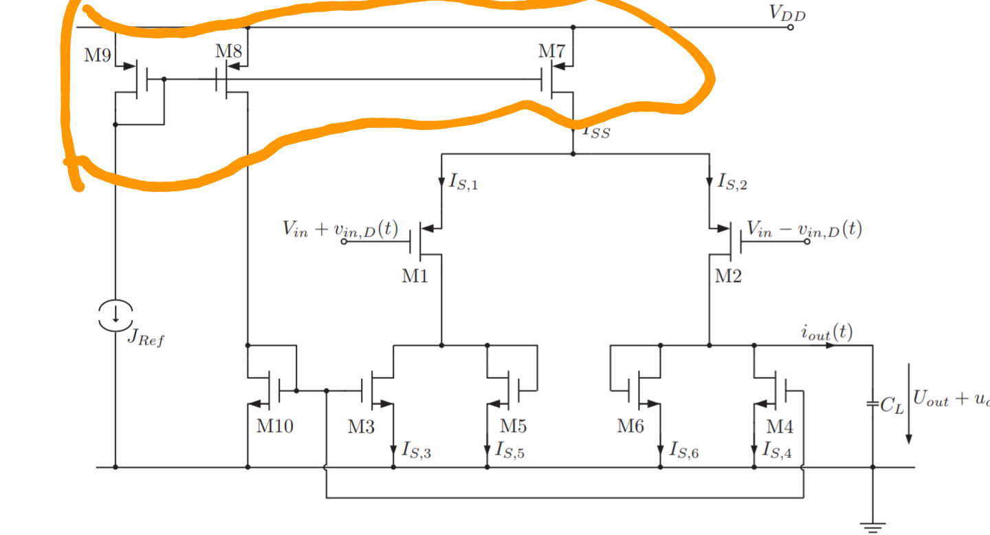 Ich sehe öfters in die bei uns vorgegebenen Schaltungen Stromspiegel in der Art wie sie im Orange umrandeten Feld gegeben sind. Das M7 über M9 angesteuert wird ist ja klar, aber ich verstehe nicht wieso das Gate von M8 auf demselben Potential liegt wie wie die von M7 und M9. Meine erste Idee war einfach nur das bei diesem Stromspiegel direkt zwei Ströme aus Jref erzeugt werden also so eine Art Dopelter Stromspiegel also das Jref den Strom durch M10 und Iss vorgibt.