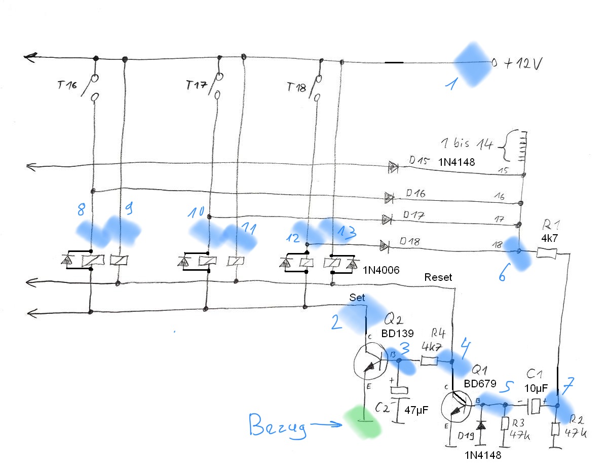 René H. schrieb: > Der Rücksetzer scheint jedenfalls zu arbeiten. Das ist das > Wichtigste. Na ja, eigentlich muss die komplette Schaltung funktionieren. Nur der „Rücksetzer“ allein nutzt ja nix. Richtig weiterhelfen kann man Dir aktuell eigentlich nicht. Man sieht nur Fragmente von der (lieblos) aufgebauten Schaltung. Dazu kommen deine etwas unverständlichen Fragen.... René H. schrieb: > Kann ich auch direkt auf die Relais auf der Relaiplatine gehen, ohne > durch die Freilaufdioden auf einen zu kommen? Vielleicht hättest Du die Schaltung erst einmal auf einem Breadboard aufbauen sollen, zunächst nur mit 2 Relais. Neben einer optischen Überprüfung würde ich Deinen Aufbau erst einmal mit einem Ohmmeter überprüfen. Außerdem würde ich die Bauteile auf die korrekten Werte überprüfen. Miss dann mal die Spannungen an den blau markierten Punkten, ohne einen Taster zu betätigen. Bezug ist GND, grün markiert. Na ja, mal sehen was noch so kommt;-)