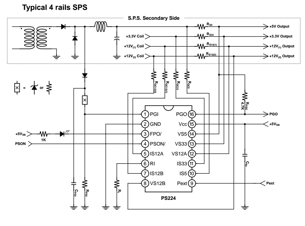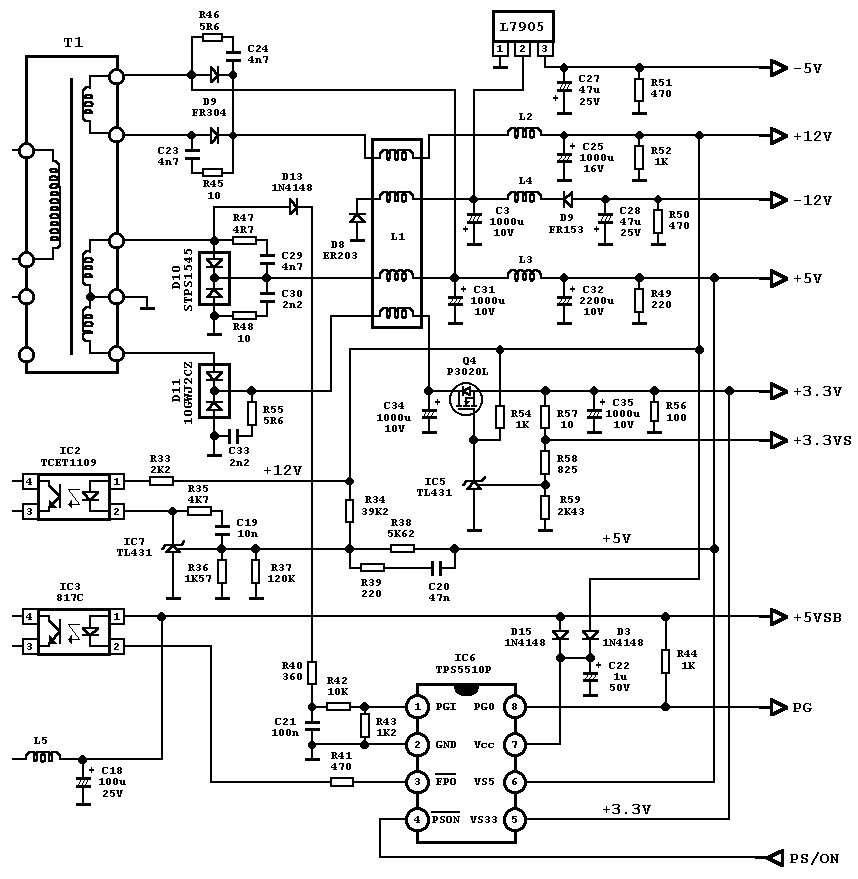 Hallo Leute, ich habe hier ein ATX Netzteil von OCZ, Modell OCZ550FTY, mit dem verschiedene Mainboards nicht mehr "starten". Alle Ausgangsspannungen liegen stabil in den Toleranzgrenzen. Als Spannungsmonitor wird ein PS224 benutzt. Nach einigen Messungen steht fest: Power Good Output (PGO) ist 0 V, da Power Good Input (PGI) zu niedrig ist (0,4 V). Ich zog das PGI auf 3,3 V und PGO war darauf hin bei 5 V. Nun frage ich mich, warum PGI zu niedrig ist, obwohl alle Spannungs stabil anliegen!? Ich habe durch Gucken und Messen einen Schaltplan erstellt. Der müsste soweit korrekt sein. Dort sieht man, das zwischen der Anode der Diode und Masse 12,2 V abfällt, über der Diode in Durchlassrichtung 2 V. Nach diversen weiteren Spannungsabfällen an Kondensatoren und Widerständen fällt also nur noch 0,4 V am PGI ab. Laut Datenblatt ist das natürlich zu wenig. Es müsste mind. 1,25 V sein, so wie ich das sehe. Woher kommt das also? Ich dachte mir, die 2 V an der Diode sind zuviel. Kann das sein? In eingebautem Zustand ergab der Diodentest 0,7 V. Ich wollte sie nun auslöten und im ausgelöteten Zustand nochmals testen. Leider war ich unvorsichtig und die Kontakte an der Diode sind abgegangen. Nun gibt es garkein Kontakt mehr und ich brauche eine neue Diode. Also es ergeben sich 2 Fragen: 1) Woran kann es liegen, dass die Spannung am PGI zu gering ist, obwohl doch alle alle anderen Spannungen korrekt sind? 2) Was für eine Diode kann ich als Ersatz nehmen? Leider gibt es keine Beschriftung. Ich hoffe die gegebene Daten und das ESB reichen aus, um eine passende zu finden. Ich liefere noch gerne weiter Infos, falls erforderlich. Schöne Grüße