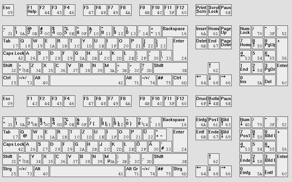 Wühlhase schrieb: > Ich kenne das hier: > https://www.tippenakademie.de/ > > In den US benutzt man QUERTY, soweit ich weiß. Unterscheidet sich von > "unserem" QUERTZ durch die Vertauschung der y- und z-Taste. Lege es doch nebeneinander ;) Da ist leider noch mehr in Unordnung. PC-105 angelehntes dürfte heute auch noch recht verbreitet sein, oben us unten de. dagegen das ins u. del für command-mode und input/replace so weit fern ab sitzen kann man nat. nichts machen aber ctrl u. caps-lock tauschen ist schon mal ein Anfang, dann die Klammern so sortieren wie beim US und die Umlaute "dahintersetzen"